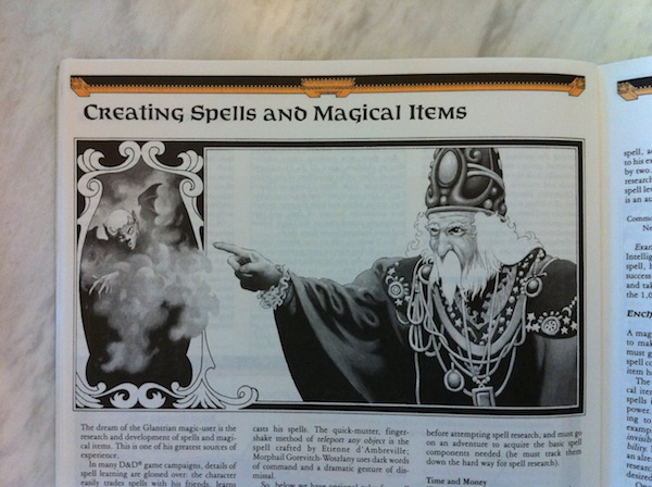 I’ve mentioned previously that I like the idea of backgrounds and themes, and I still like the idea after seeing a few actual examples on the pregen character sheets. I’m not crazy about all of the abilities, but the underlying concept is solid, and a huge improvement over the raw skills and feats available in Third and Fourth. Backgrounds as presented are a slightly more elaborated version of the original “secondary skill” systems present in 1E and 2E. The backgrounds are a nice way to add some detail to a character without wasting time on extensive backstory that (let’s face it) rarely gets read by anyone other than the writer. Put the list of backgrounds on a random table and that would make a pretty good character creation tool (compare to the recent Before First Level posts over at The Dungeon Dozen). The backgrounds as given by the pregens are knight, priest, soldier, commoner, and sage.