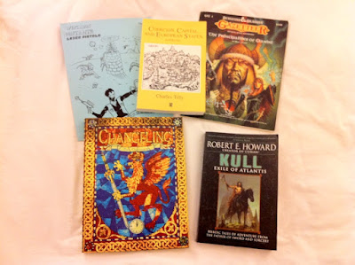 In case that picture is not clear, those are WMLP No. 1, Coercion, Capital, and European States: AD 990 – 1992, the old D&D Gazetteer GAZ3 The Principalities of Glantri, Changeling: The Dreaming (for some faerie inspiration), and the aforementioned Kull collection.